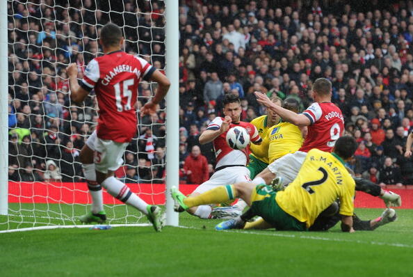 siapa pencetak gol itu, apakah Giroud menyentuh bola atau bek Norwich yang